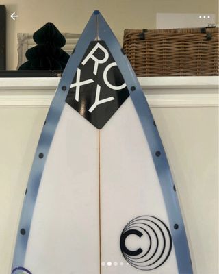 Tabla de surf Cabianca de 5 pies y 3 pulgadas. Ideal para disfrutar de las olas. - Marca: Cabianca - Medida: 5'3 - Diseño: ROXY - Logo de Iberdrola - Logo de Oakley