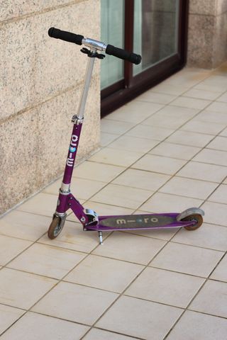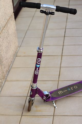 Patinete de la marca Micro en color morado. Ideal para desplazamientos urbanos. - Manillar ajustable. - Ruedas de goma. - Plataforma antideslizante.