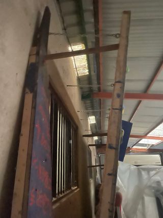 Rocódromo de madera con presas de escalada. - Medidas: alto 2'7m x ancho 2'9m - Inclinación regulable - bisagra central con giro 90 grados para convertir la pieza superior en techo.