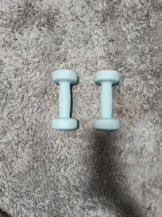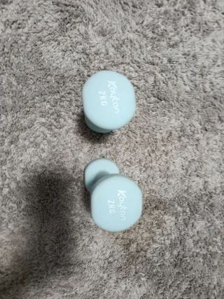 Pack de dos pesas de 2 kg cada una, compradas en Decathlon. Ideales para entrenamientos en casa. - Color: azul claro. - Peso: 2 kg por pesa.