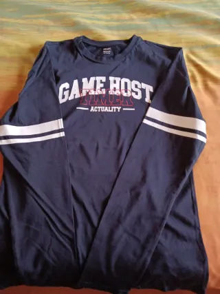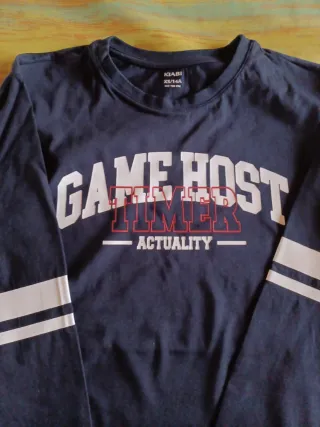 Camiseta azul marino de manga larga con diseño GAME HOST TIMER ACTUALITY y detalles de rayas blancas en las mangas. - Talla: XS (14 años) - Altura recomendada: 152-158 cm - Diseño estampado en la parte delantera - Puños y cuello elásticos