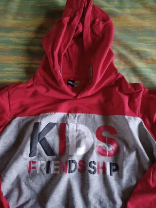 Sudadera con capucha de dos colores, ideal para niños. - Diseño con texto KIDS FRIENDSHIP. - Mangas y capucha en color rojo. - Cuerpo principal en color gris.