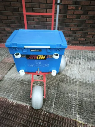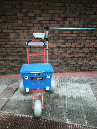 Carro de pesca Turkana con ruedas grandes para arena. - Ruedas de gran tamaño para facilitar el transporte en terrenos blandos. - Estructura robusta. - Incluye caja azul. - Bandeja superior. - Incluye percha porta bajos. - Incluye rueda delantera desmontable. - Incluye porta nevera.