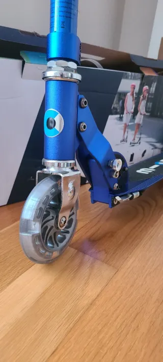 Patinete Micro Sprite en color azul con luces LED en las ruedas. - Ruedas LED que se iluminan al girar. - Manillar ajustable en altura. - Plegable para facilitar su transporte.