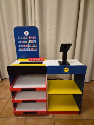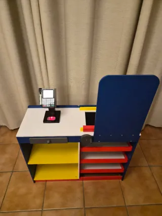 Supermercado de juguete para niños, fabricado en madera, casi sin usar. - Diseño colorido con estanterías y pizarra. - Con escáner con luz, pago con targeta y caja. - Incluye monedas y billetes, cesta para la compra, boli para pizarra y separador de productos.