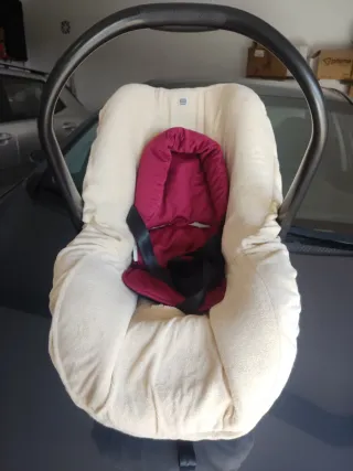 Silla de coche para bebé Maxi-Cosi con funda. - Funda exterior de tela color crema. - Interior acolchado en color burdeos. - Asa de transporte. - Arnés de seguridad.