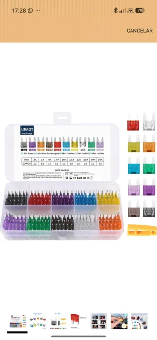 Set de 120 fusibles mini para coche con pinzas para su extracción. - Incluye fusibles de diferentes amperajes: 2A, 3A, 5A, 7.5A, 10A, 15A, 20A, 25A, 30A y 35A.40A - Cada amperaje viene en una cantidad de unidades. - Incluye pinzas para facilitar la extracción y colocación de los fusibles.