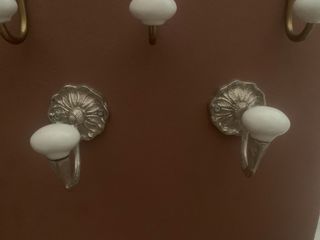Elegante perchero de pared con un diseño clásico y funcional. - Base metálica con detalles ornamentales. - Cuatro ganchos con pomos de porcelana blanca.