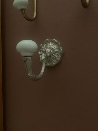Elegante perchero de pared con un diseño decorativo floral en la parte superior. Cuenta con cinco ganchos individuales. - Diseño floral decorativo. - Cinco ganchos de porcelana. - Estructura metálica.