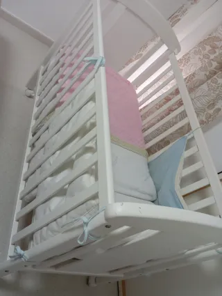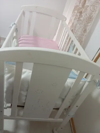 Cuna de bebé en buen estado, lista para usar. Incluye colchón. - Estructura de madera blanca. - Diseño clásico con barrotes. - Colchón incluido. Más info llama o pregunta al 679612764