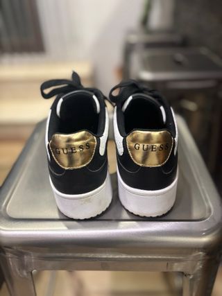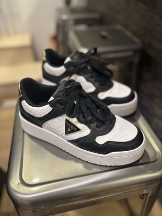 Zapatillas de la marca Guess con un diseño moderno. - Combinación de colores blanco y negro. - Detalle de logo triangular en el lateral.