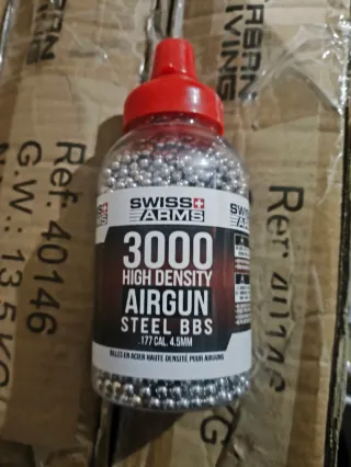 Botes de bolas de acero para airgun de la marca Swiss Arms. - 3000 unidades. - Calibre .177 / 4.5mm. - Alta densidad. - Sin abrir.