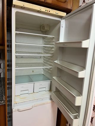 Frigorífico de dos puertas en color blanco. - Compartimento de congelador. - Diseño clásico. Tiene algunos desperfectos pero funciona correctamente. El comprador deberá recogerlo.
