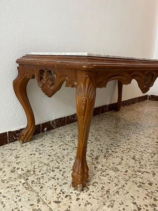 Elegante mesa auxiliar con un diseño clásico. - Encimera de mármol. - Patas y estructura de madera. - Acabado en tono marrón.