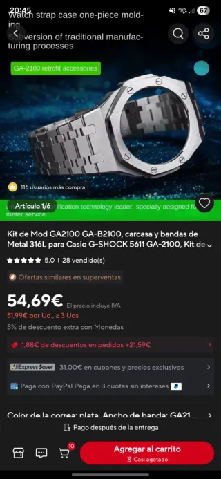 Kit de modificación para reloj Casioak. Casio GA2100 - GA-B2100, GShock 5611... Totalmente nuevo, en su caja. Precio en Aliexpress 55€ - Diseño octogonal. - Acabado plateado.