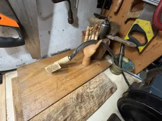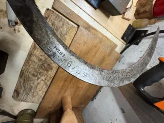 Hoz antigua con mango de madera Una pieza con carácter. - Hoja curva de metal. - Mango de madera robusto.