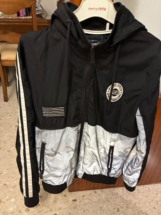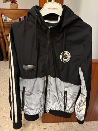Chaqueta con capucha para hombre, con un diseño moderno y llamativo. - Parte superior en color negro. - Parte inferior con estampado de camuflaje reflectante. - Bandas blancas en las mangas. - Cierre de cremallera frontal. - Bolsillos con cremallera.