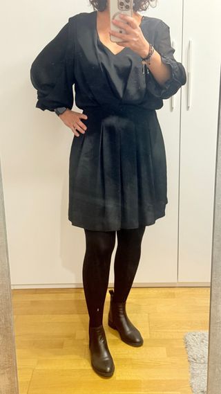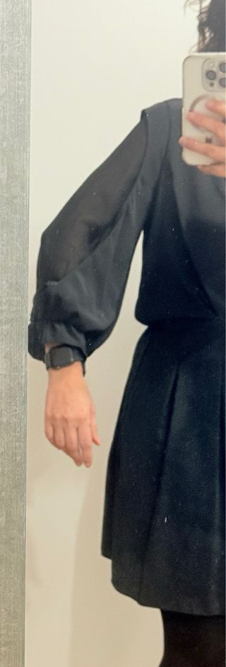Vestido Naf Naf de color negro, con un diseño elegante. - Mangas abullonadas. - Escote en V. - Falda con pliegues.