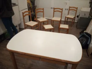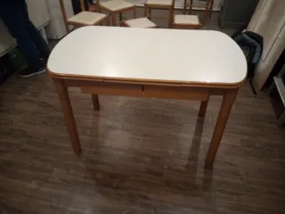 Conjunto de mesa extensible con 2 cajones y 6 sillas de madera con asientos tapizados. - Mesa con superficie blanca. Medidas 70cm de ancho y 120cm de largo con dos laterales extensibles de 30cm, haciendo así una mesa de 180cm aproximadamente. - 6 sillas de madera, 4 de ellas con respaldo curvo. - Asientos acolchados.