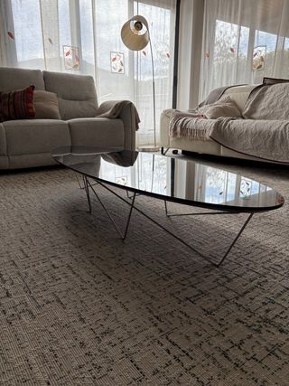 Elegante mesa de centro con un diseño moderno y minimalista. Su superficie de cristal oscuro y patas metálicas le dan un toque sofisticado a cualquier sala. - Encimera de cristal. - Patas de metal.