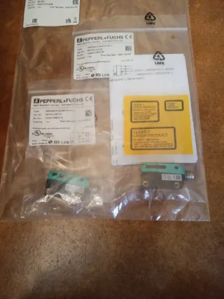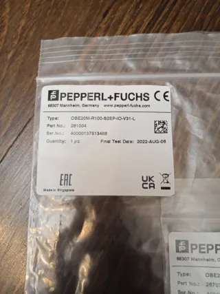 Sensor Pepperl+Fuchs modelo OBE20M-R100-S2EP-IO-V31-L. - Fabricado en Alemania. -Conjunto emisor-receptor - Fecha de prueba final: 2022-AUG-06. - Hecho en Singapur.