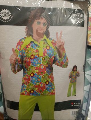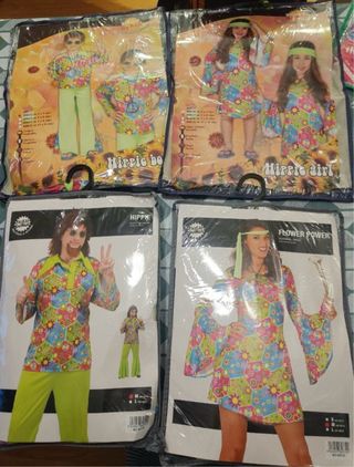Conjunto de disfraces inspirados en la moda hippie, ideales para fiestas temáticas o carnaval. Incluye modelos para niños y adultos. - Diseños coloridos con estampados florales y geométricos. - Estilo retro de los años 60 y 70. TALLAS: Chica talla M Chico talla M Niño talla 3-4 años Niña talla 5-6 años ( no tiene cinta de pelo) 40€ los 4, por separado 12€ cada uno. Algunos usados una vez, oros sin estrenar.