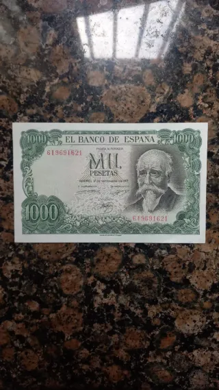 Billete de 1000 pesetas del Banco de España, emitido en 1971. En muy buen estado. Muy poco Circulado - Denominación: 1000 pesetas - Año de emisión: 1971 - País: España - Emisor: El Banco de España MAS MONEDAS Y BILLETES EN MI PERFIL. ENVÍO WALLAPOP, CORREO ORDINARIO O EN MANO.