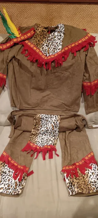 Disfraz de indio tribal con detalles de estampado animal. - Túnica marrón con cuello y puños decorados. - Pantalones a juego. - Cinturón con estampado. - Diadema con plumas.