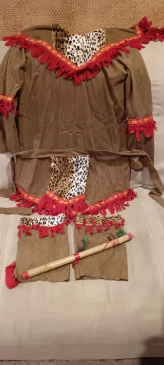 Disfraz de inspiración nativa americana para niña. - Túnica marrón con detalles de flecos rojos y estampado de leopardo. - Cinturón a juego. - Puños con flecos y estampado de leopardo. - Polainas a juego con flecos y estampado de leopardo. - Accesorios de plumas y bastón de madera.