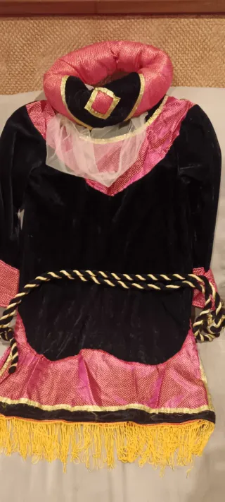 Disfraz de estilo árabe para niña, talla 10-12 años. Incluye un turbante a juego. - Vestido negro con detalles en rosa y dorado. - Cinturón trenzado dorado y negro. - Falda con flecos amarillos.