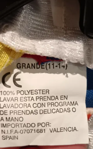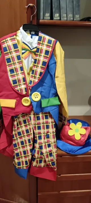 Disfraz de payaso colorido y divertido, listo para la fiesta. - Incluye traje completo y sombrero. - Diseño a cuadros vibrante en rojo, azul y amarillo. - Detalles con botones grandes y bolsillos. - Sombrero con flor decorativa.