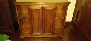 Mueble de madera maciza con acabado tipo cerezo. Presenta un diseño rústico y elegante, ideal para cualquier estancia. - Puertas centrales con tiradores discretos. - Estantes abiertos a los lados. - Cajones inferiores con tiradores. - Acabado en madera maciza.