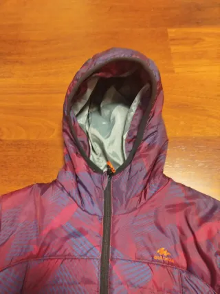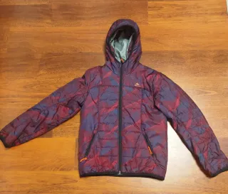 Chaqueta con capucha de la marca Quechua, ideal para niños. - Diseño estampado en tonos morados y azules. - Cierre de cremallera frontal. - Bolsillos laterales con cremallera y tirador naranja. - Capucha integrada. Talla 10-11 años. Está como nueva, de poco uso. 141-148 cm.
