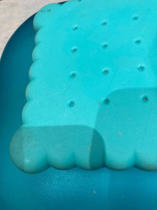 Galletero de diseño vintage en color azul. - Forma cuadrada con borde ondulado. - Superficie con pequeños orificios. - Material de plástico resistente.