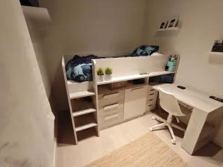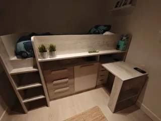 Conjunto de muebles para habitación infantil, ideal para optimizar el espacio. - Cama elevada con escaleras. - Escritorio integrado. - Cajones y estantes de almacenamiento.