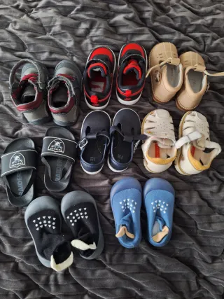 Entero lote de 8 pares de zapatos para niño en talla 21. Incluye varios pares de estilos diferentes. - Zapatos tipo botín grises y burdeos Comfort Dry by chetto. - Zapatillas deportivas negras y rojas Nike. - Zapatos de vestir con suela de cuero marrón claro Orto Parvelin. - Chanclas negras Raiders - Zapatos de vestir azul marino Tex baby. - Zapatos tipo sandalia beige Pablosky. - Zapatillas de estar por casa negras y azules.