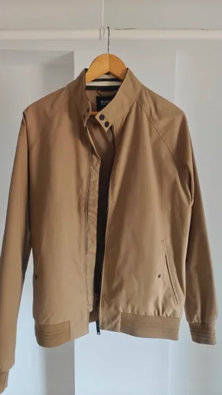 Chaqueta de estilo bomber en color beige. - Cuello alto con cierre de botón. - Cremallera frontal. - Bolsillos laterales con botón. - Puños y bajo elásticos.