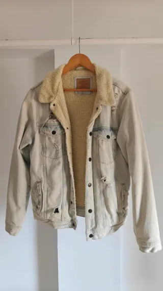 Chaqueta vaquera con forro interior de borreguito. - Diseño desgastado y con rotos. - Cuello de borreguito. - Cierre de botones metálicos.