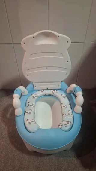 Orinal infantil con diseño de vaquita, ideal para los más pequeños. - Color azul y blanco. - Asiento acolchado con estampado de vacas. - Reposabrazos laterales. Tiene el plastiko ke recubre la esponjita donde se apoya el culete un poko rota...ya se ve en la foto. Es de meterla en la lavadora...siempre puede sustituirse por algo A mi hijo le encantaba hacer pipi y popo en este orinal.