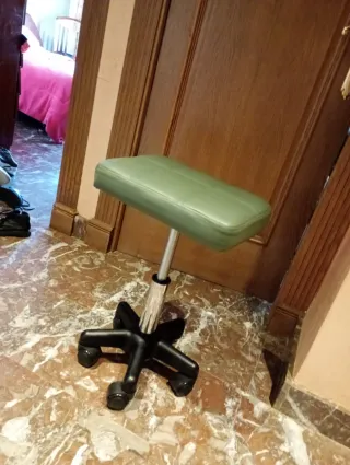 Taburete con asiento acolchado y base giratoria. - Asiento de color verde. - Base negra con ruedas. - Altura ajustable.