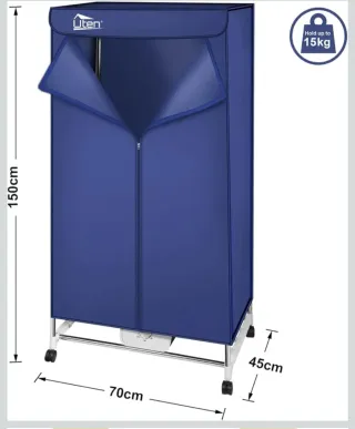 Armario portátil para secar ropa, con estructura de metal y cubierta de tela. - Medidas: 150cm (alto) x 70cm (largo) x 45cm (ancho). - Capacidad de carga de hasta 15kg. - Ruedas para facilitar el desplazamiento.