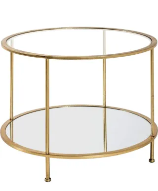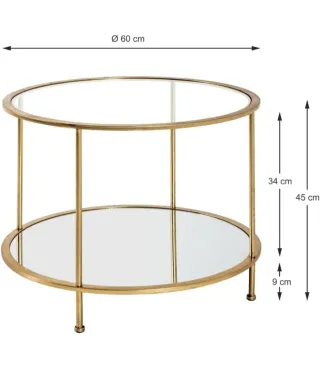 Elegante mesa auxiliar redonda con un diseño moderno y sofisticado. - Estructura metálica en acabado dorado. - Superficie superior e inferior de cristal. - Patas finas y estilizadas.