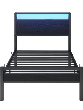 Marco de cama moderno con un diseño elegante que combina metal y madera. - Panel de cabecero con iluminación LED azul. - Estructura robusta de metal. - Detalles en madera con veta oscura.