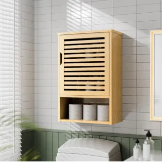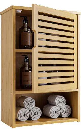 Armario de pared para baño, fabricado en bambú. Su diseño colgante es ideal para optimizar el espacio. - Puerta con lamas de bambú. - Estantes interiores. - Asa para abrir la puerta.
