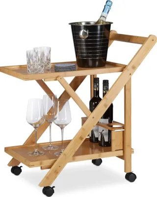 Carrito auxiliar plegable, perfecto para servir o como mesa auxiliar. Su diseño permite guardarlo fácilmente. - Fabricado en bambú y madera. - Color natural y gris. - Con ruedas para facilitar su movilidad.