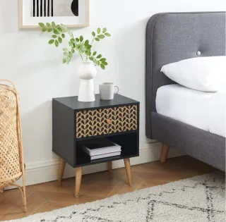 Mesita de noche moderna con un diseño único. - Patas de madera. - Cajón con detalle de patrón. - Compartimento abierto.