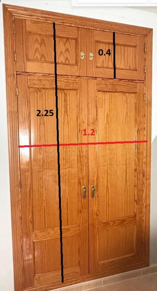 Frentes de armarios empotrados de madera maciza en perfecto estado. - Diseño clásico con puertas de madera. - Tiradores dorados. - Acabado natural. - Altura total 2.25 altura del maletero 0.4 y anchura de 1.2 en dos hojas abatibles de 60 cm. Disponible 4 unidades . Precio individual 80 €, precio de los 4 armarios 240 €