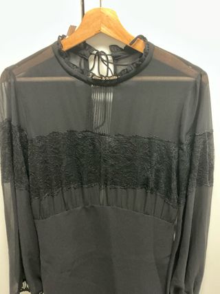 Elegante vestido de Mango con detalles de gasa y encaje. - Diseño con cuello alto y lazada. - Mangas largas abullonadas. - Cintura marcada con pliegues. - Bajo con lazada lateral.