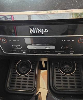 Freidora de aire Ninja con tecnología DualZone. Es un artículo usado con signos visibles de uso. Funciona perfectamente. - Dos cestas independientes para cocinar diferentes alimentos. - Controles de temperatura y tiempo. - Funciones: Max Crisp, Air Fry, Roast, Reheat, Dehydrate, Bake. - Sincronización de cocción (Sync) y coincidencia de tiempo y temperatura (Match).