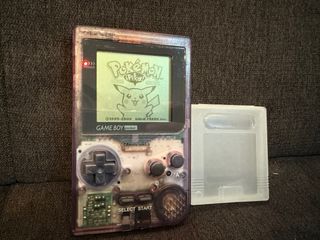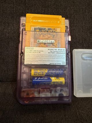 Consola portátil clásica. - Modelo Game Boy Pocket con amplificador de sonido. - Carcasa translúcida morada. - Incluye funda protectora para cartuchos. Juego de Pokemon Amarillo con pila nueva para guardar partidas.